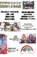 3/8(日)まで『壽丸屋敷のほっこりおひな展』開催ですが3/14(土)~4/13(月)まで壽丸屋敷洋間にて『チクチク・トントン春のおくりもの展』が開催になります。作家さんは次の方々です。〇chat.qui.peche(シャ.キ.ペッシュ)・・・アクセサリー/ナチュラル生地のバック、小物〇山織家山家千秋・・・裂き織り/柿渋染めの手ぬぐいのバック、小物〇夢美屋/大泉三保・・・草木染めのショール、小物、手織りマフラーお楽しみに~!